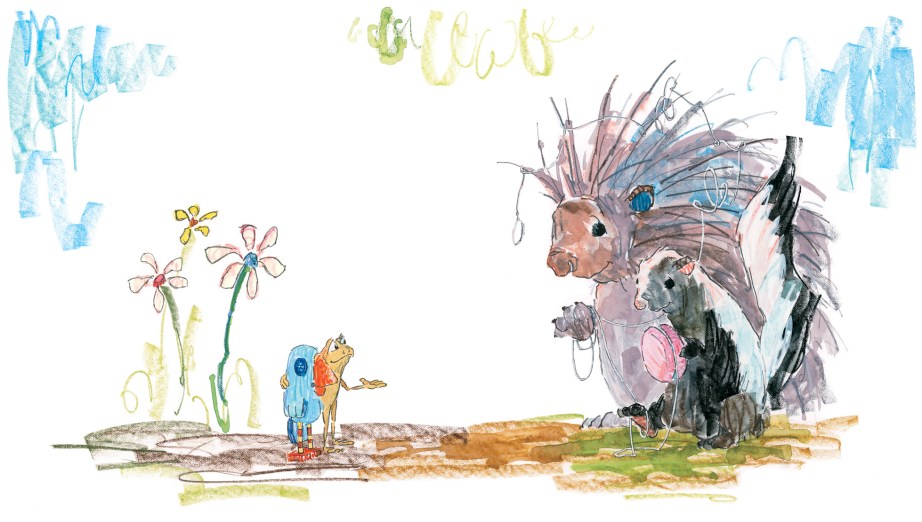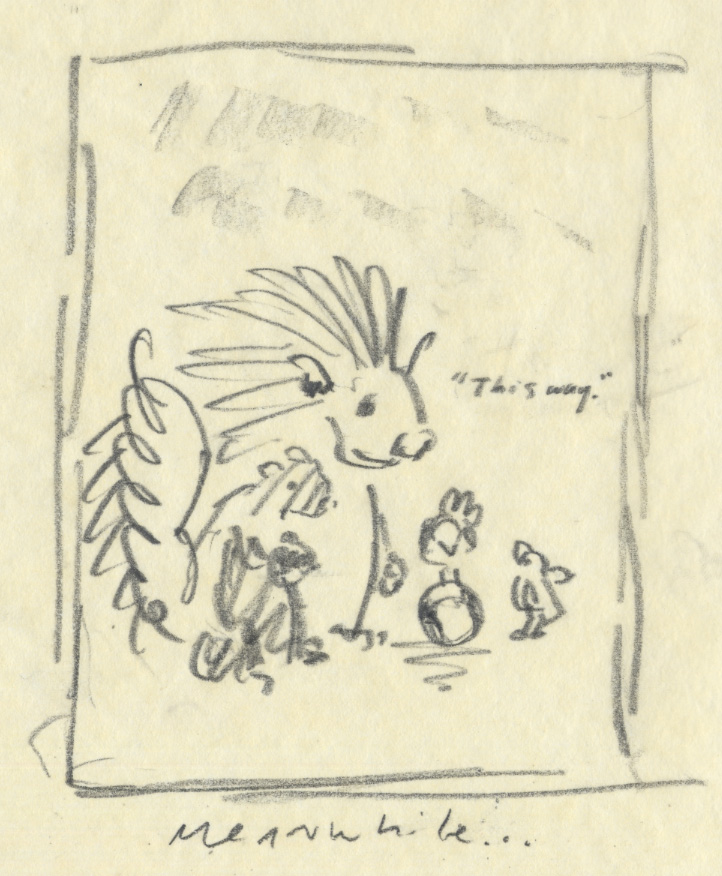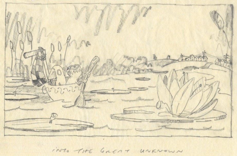 We did lots and lots of preliminary sketches. Unfortunately the story wasn’t really very good. In fact, it was a mess. The artwork was kind of unimpressive too. Eventually we decided it wasn’t yet possible for us to mix our art styles without making the sum lesser than the individual parts. So the story and artwork reverted back to me by default. Although the story was not quite right yet, I decided it was time to show our editor and art director at Roaring Brook Press, Neal and Jennifer. We tend to pitch ideas to them over lunch or coffee in a casual sort of way, so there’s not a lot of pressure to be perfect. The story we pitched went something like this: Vernon, a toad, lives in a cuckoo clock house by the river. One day a big storm damages the house. He and his upstairs neighbor, Bird, go on an adventure heading down the river in a teacup to look for a new home. Eventually they return home where they started, fix up the old house, and everyone lives happily ever after.