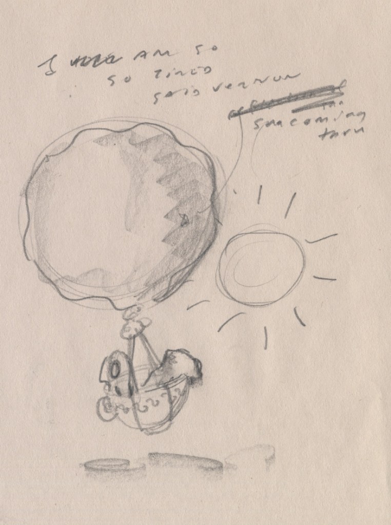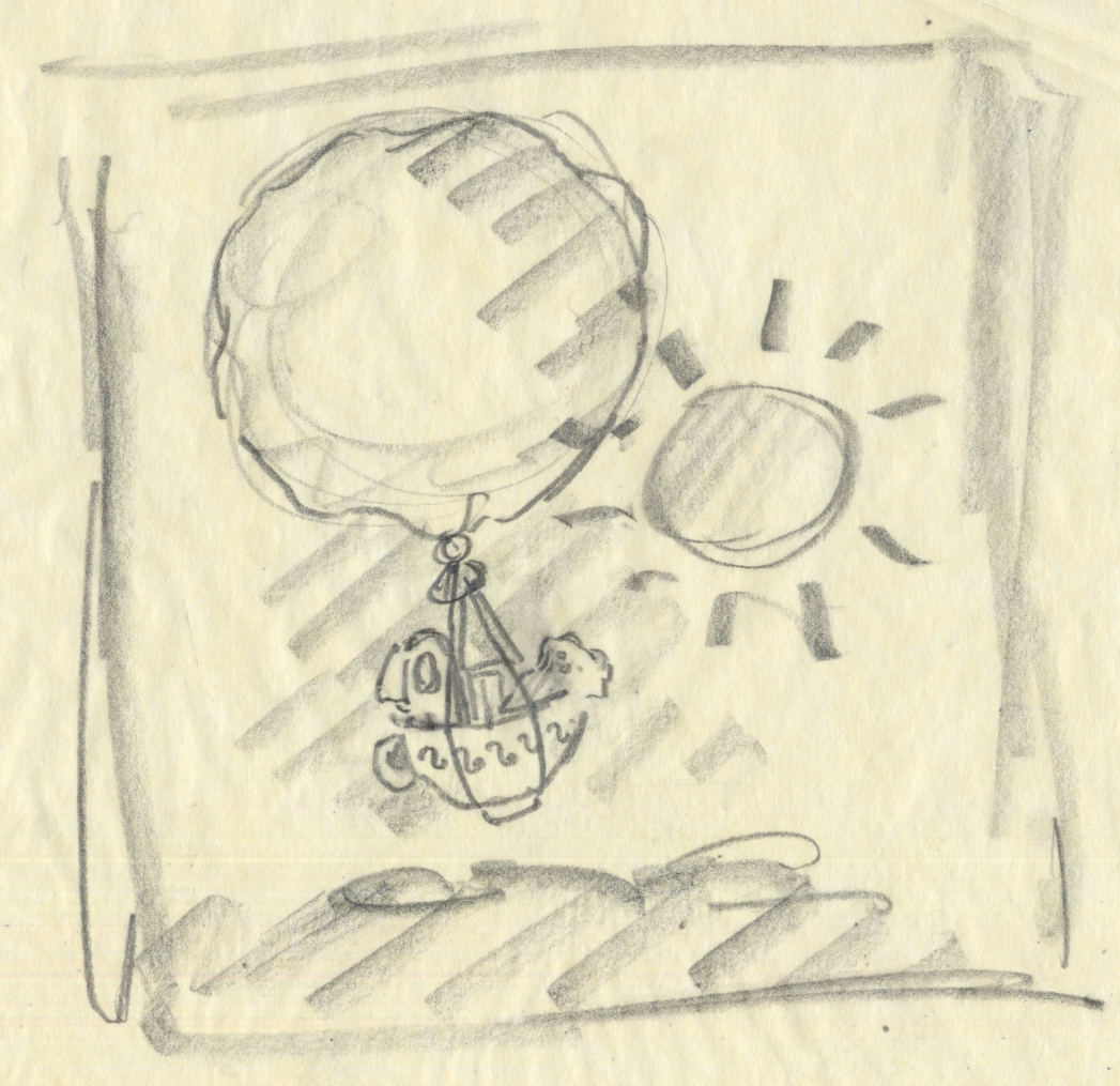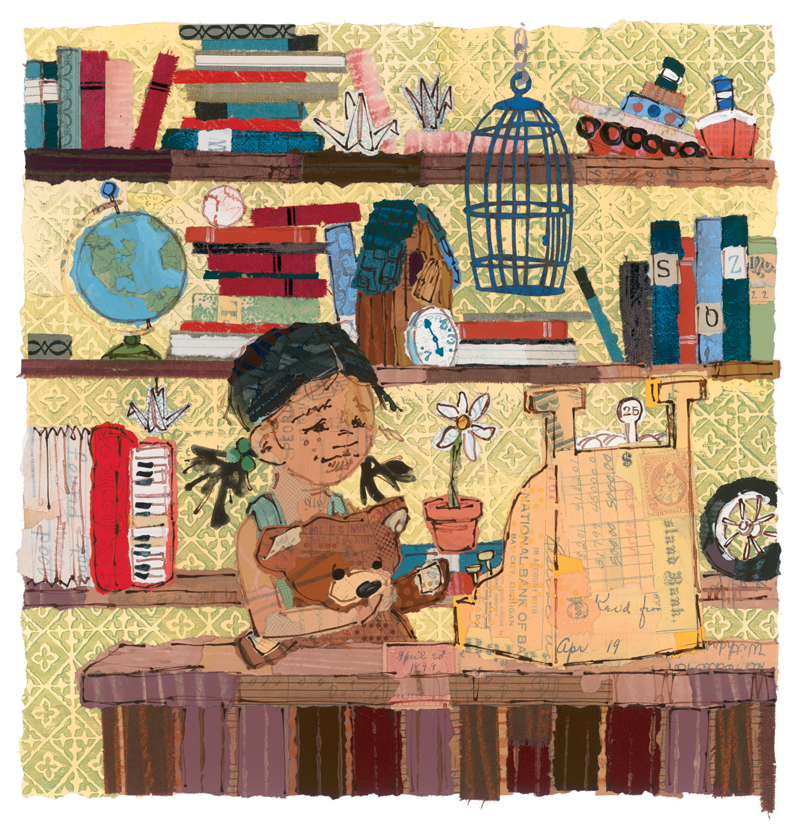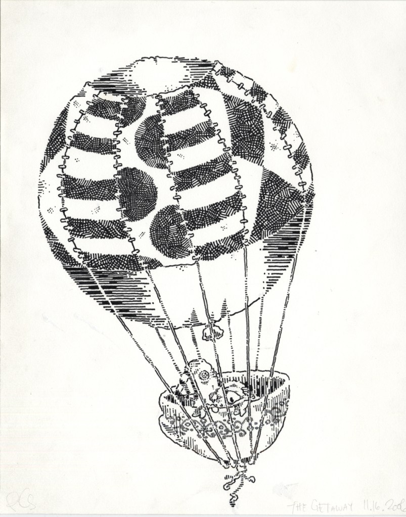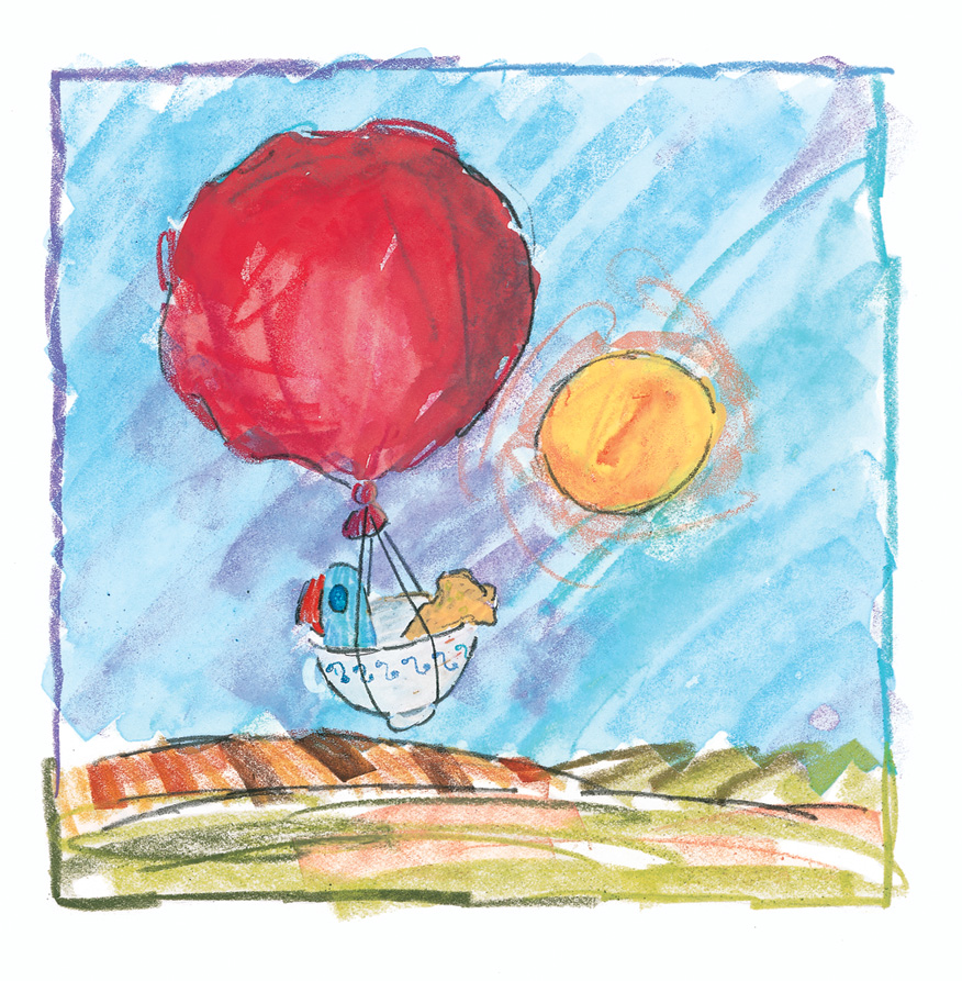 I made more and more of these images until a kind of story began to develop. It was only natural that a cuckoo bird would become a supporting character. I had them do things with each other, like fly a hot air balloon made from a teacup and scraps and cloth sewn together: