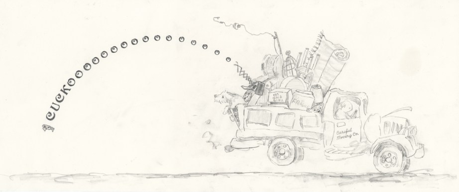That became the turning point, in that it gave me a more plausible premise: What if a cuckoo bird went flying off the back of a moving truck?