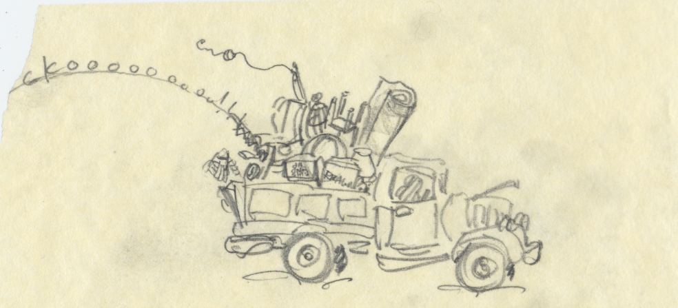 Having moved by now five times in four years, moving was very much on my mind. The image of a ramshackle moving truck came to me one day.