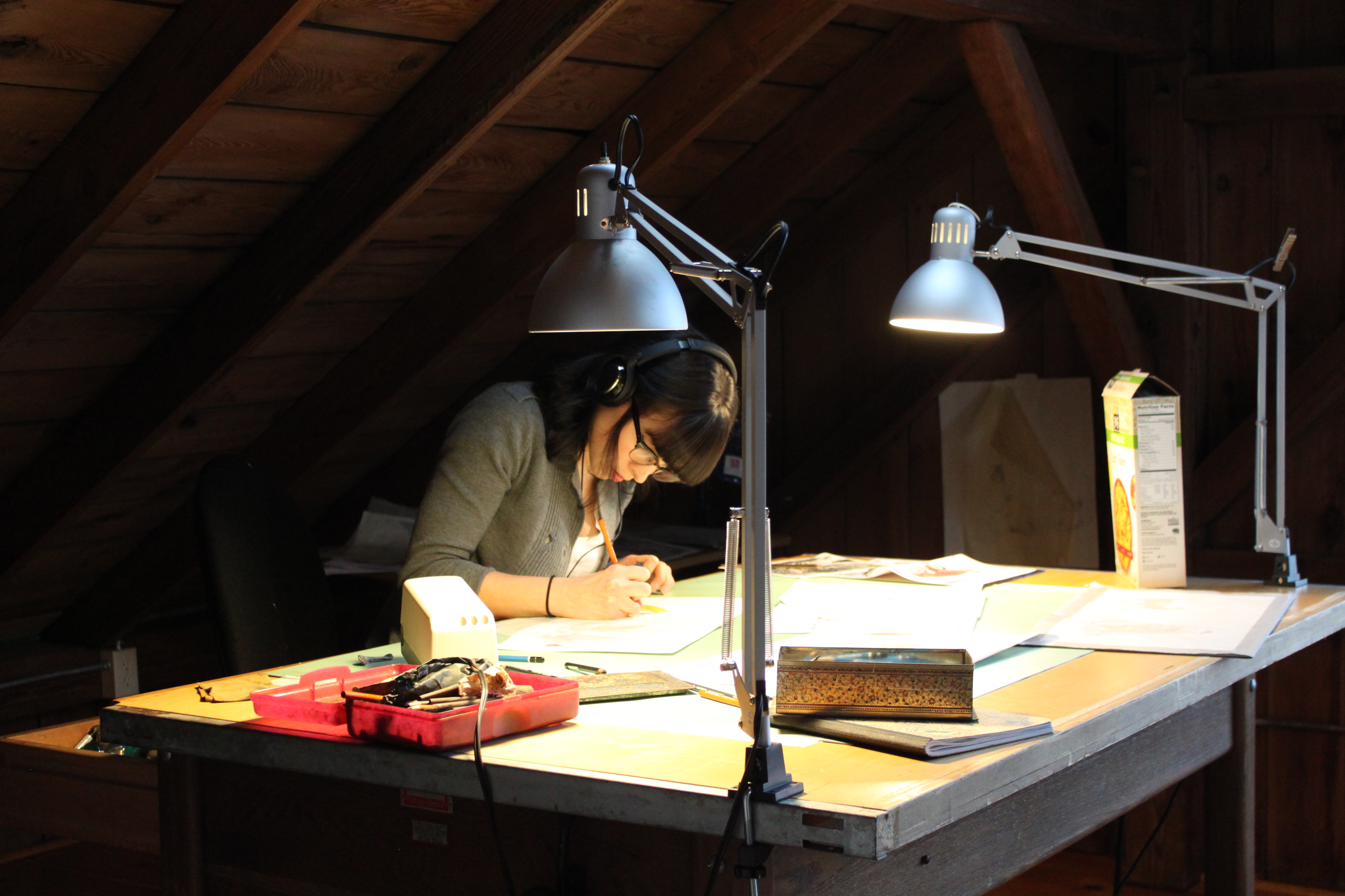 You might wonder what a studio where much art is being made smells like. Well, I have a surprise for you. Today, it’s one part expected – the spray fixative on the left which Philip and Erin use to set their art once it’s finalized – and one part unexpected – the wintergreen essential oil on the right. Erin is using the oil for some transfer work on the book she is currently making and it’s been a delightful smell around the studio for the last few winter months. Think fresh trees during the part of winter where you’re still excited about winter smells.